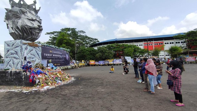 Pantauan detikJatim di lokasi, Rabu (5/10/2022) pagi, banyak karangan bunga diletakkan di sekitar patung Singa yang berada di luar stadion. Menurut warga, karangan bunga ucapan dukacita sudah berdatangan sejak Senin (3/10).