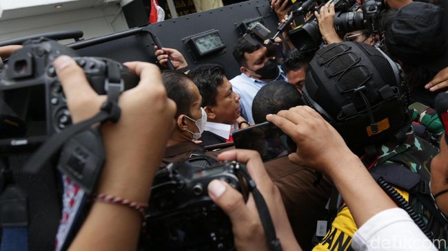 Ferdy Sambo telah meninggalkan Kejaksaan Agung (Kejagung) RI dengan mengenakan pakaian tahanan berwarna merah. Sambo dijaga ketat Brimob Polri dan tentara saat meninggalkan gedung Jampidum Kejagung.