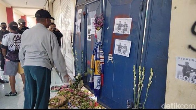 Tampak pula di gagang pintu itu tergantung syal Aremania dan bunga-bunga di lantai kondisi Stadion Kanjuruhan terkini. Selain itu tampak kertas putih bertuliskan "Stop Brutality Police" yang ditempel bergambar seorang pria menggendong anak-anak yang terjebak saat ada gas air mata disemprotkan di tribun.