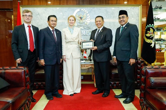 Ketua MPR RI Bambang Soesatyo bertemu dengan Wakil Ketua Parlemen Ukraina H.E. Mrs Olena Kondratiuk di Komplek MPR RI Jakarta, Rabu (5/10). Pada pertemuan itu, Olena mengajak Indonesia terlibat langsung dalam pembangunan kembali Ukraina setelah konflik militer dengan Rusia.