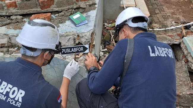 Dalam olah TKP, Puslabfor mengambil sampel puing bangunan seperti dinding bata dan juga beton dinding yang roboh. Nantinya, sample tersebut akan diteliti di Puslabfor Polri.