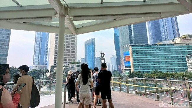 Anjungan Halte Bundaran HI, Jakarta Pusat, diburu warga. Spot favorit anjungan atau sky deck view yang berada di lantai dua halte ini ramai dikunjungi warga hingga rela mengantre.