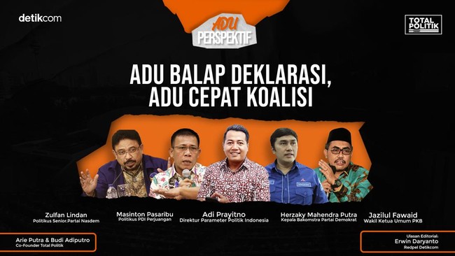 Semua ini dibahas dalam diskusi terbuka Adu Perspektif dalam topik 'Adu Balap Deklarasi, Adu Cepat Koalisi' bersama Zulfan Lindan (politikus senior Partai NasDem), Masinton Pasaribu (politikus PDI Perjuangan), Adi Prayitno (Direktur Parameter Politik Indonesia), Herzaky Mahendra Putra (Kepala Bakomstra Partai Demokrat), dan Jazilul Fawaid (Wakil Ketua Umum PKB). Acara disiarkan secara langsung dari detikcom, Selasa (11/10/2022) pukul 20.00 WIB.