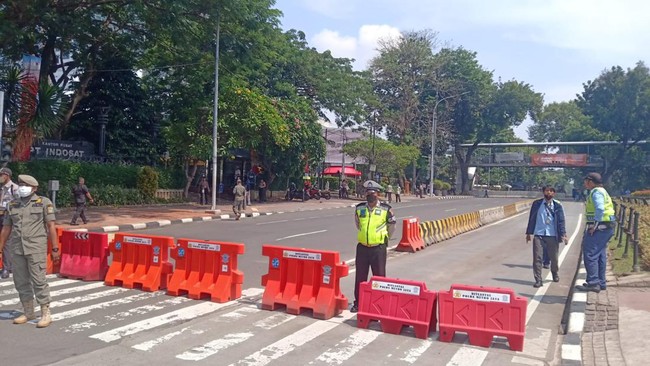 Dilihat dari foto yang diunggah akun TMC Polda Metro Jaya, Jl Medan Merdeka Barat ditutup dengan water barrier. Sejumlah polisi juga telah siaga di lokasi.