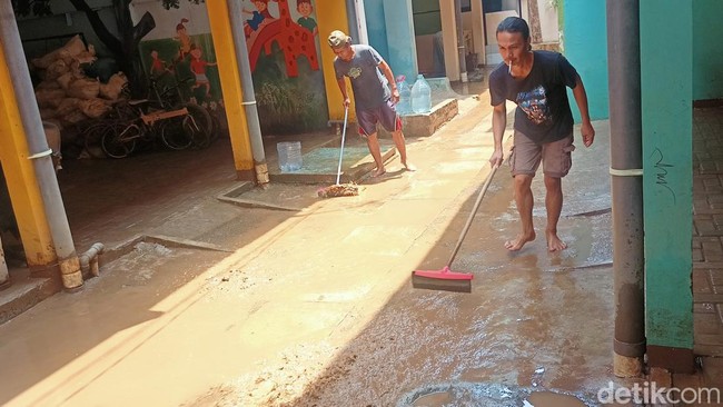 Warga mulai membersihkan lumpur sisa banjir dari dalam rumahnya. Sejumlah petugas Penanganan Prasarana dan Sarana Umum (PPSU) terlihat membantu warga membersihkan lumpur.