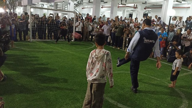 "Ayo, kamu dulu yang nendang ya," ucap Anies kepada salah seorang anak di lokasi.