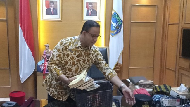 Gubernur DKI Jakarta Anies Baswedan dan Wagub Ahmad Riza Patria mulai mengemasi barang-barang yang terdapat di kantornya. Barang-barang yang dikemas keduanya mulai dari berkas hingga buku-buku.