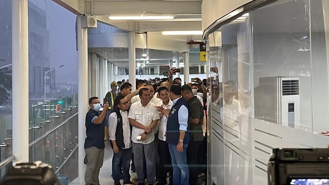 Pantauan detikcom di lokasi, Sabtu (15/10/2022), pukul 17.10 WIB, tampak sejumlah orang petugas berusaha mendorong air yang tergenang ke arah luar halte. Kala Anies tiba, kondisi lantai dua halte itu masih tergenang air pascahujan lebat.