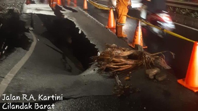 Polda Metro pun megunggah beberapa foto di lokasi. Tergambar area jalan yang longsor cukup lebar.