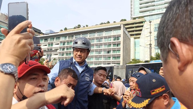 Anies yang baru tiba dari arah Dukuh Atas langsung diserbu oleh warga. Mereka mengerumuni Anies untuk mengajak berfoto bersama-sama.