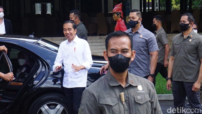 Presiden Joko Widodo (Jokowi) menyambangi Pendopo Royal Ambarrukmo Yogyakarta bersama sejumlah menteri. Jokowi dikabarkan datang untuk mengecek salah satu alternatif venue pernikahan Kaesang dengan Erina Gudono.