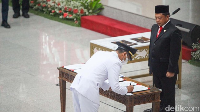 "Saya sedikit saja pertama saya ucapkan terima kasih kepada Bapak Presiden, Bapak Wapres, tentunya pemerintah, Pak Mendagri, saya hari ini sudah dilantik," kata Heru di Kantor Kemendagri, Jl Medan Merdeka Utara, Jakarta Pusat.