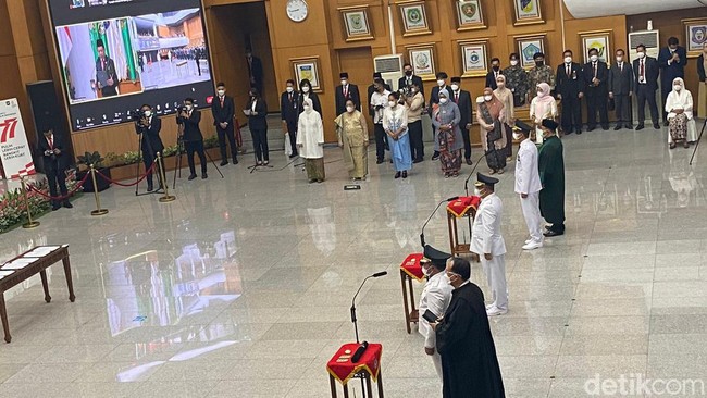 Melalui acara ini pula, pemberhentian dengan hormat Anies Baswedan dan Ahmad Riza Patria sebagai Gubernur dan Wakil Gubernur DKI disahkan.