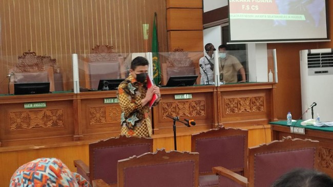 Dia terlihat memegang buku dan salinan dakwaan. Ferdy Sambo kemudian duduk di kursi terdakwa.