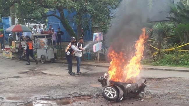 Sebuah motor otomatis Vespa terbakar di Jalan Raya Grand Depok City (GDC), Cilodong, Depok, Jawa Barat (Jabar). Kondisi lalu lintas (lalin) di lokasi sempat macet.