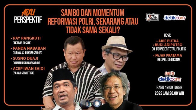 Malam ini adu perspektif menangkat topik "Sambo dan Momentum Politik Reformasi Polri" bersama Ray Rangkuti (Aktivis Sosial), Panda Nababan (Jurnalis Hukum Senior), Susno Duaji (Mantan Kabareskrim) dan Acep Iwan Saidi (Pakar Semiotika). Acara disiarkan secara langsung dari detikcom, Rabu 19 Oktober 2022 pukul 20.00 WIB.
