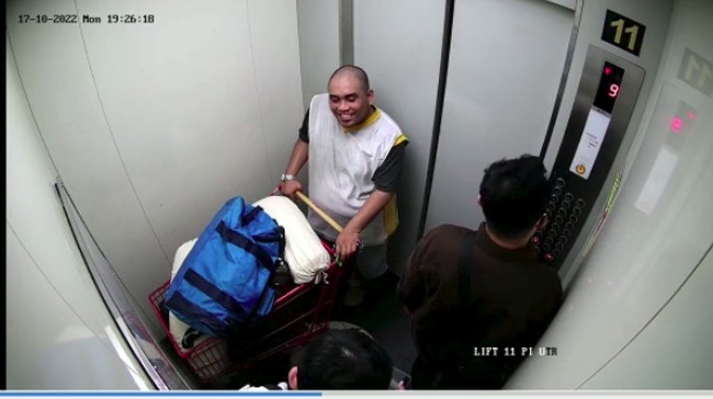 CCTV tersebut berada di dalam lift. Tersangka R, yang berkepala plontos, tampak mendorong troli masuk ke lift.