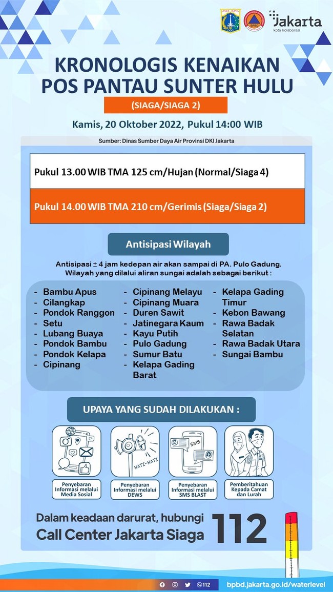 "Kami BPBD DKI Jakarta menginformasikan bahwa pada pukul 14.00 WIB ketinggian Pos Sunter Angke Hulu 210 cm, gerimis, dalam status siaga 2," kata petugas BPBD DKI Jakarta dalam video yang diunggah di akun Twitter BPBD @BPBDJakarta, Kamis (20/10/2022).