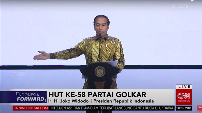 Hal ini disampaikan Jokowi saat menyampaikan sambutan di HUT Golkar di JIEXPO Kemayoran, Jakarta Pusat, Jumat (21/10/2022). Jokowi sendiri berbicara usai Ketua Umum Partai Golkar Airlangga Hartarto memberikan sambutan terlebih dulu.