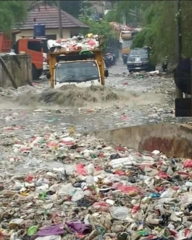 Sementara itu, banjir juga terjadi di jalan sekitar area TPA Cipayung. Sampah-sampah terbawa ke jalan yang tergenang karena tersapu banjir.