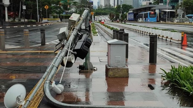 Tiang rambu penyeberangan orang atau pelican crossing di kawasan Sudirman, Jakarta, roboh. Diduga tiang rambu penyeberangan itu roboh diterpa angin kencang.