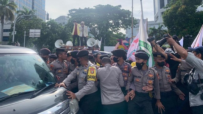 Massa hendak turun ke badan jalan. Hal ini membuat mereka terlibat dorong-dorongan dengan polisi yang berupaya menghalangi mahasiswa turun ke ruas jalan.