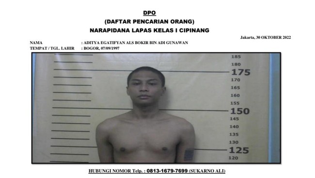Seorang narapidana (napi) bernama Aditya Egatifyan alias Bokir (25) kabur dari Lembaga Pemasyarakatan (Lapas) Kelas I Cipinang, Jakarta Timur. Bokir kini telah masuk daftar pencarian orang (DPO).