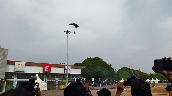 Selain demonstrasi oleh Kopassus, dilakukan juga demonstrasi lainnya. Termasuk operasi terjun payung. Terlihat para prajurit penerjun terbaik bergantian terjun dari ketinggian kaki dan mendarat di lokasi perhelatan Indo Defence. Para penerjun juga mengibarkan beberapa bendera, mulai dari bendera Merah Putih Republik Indonesia hingga Kementerian Pertahanan.