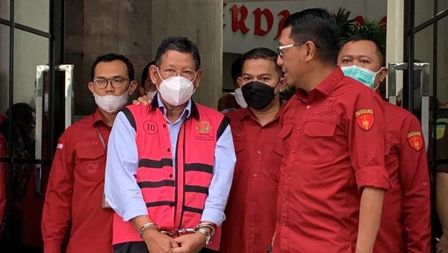 Pantauan detikcom di Gedung Bundar Jampidsus Kejagung, Jalan Sultan Hasanuddin, Kebayoran Baru, Jakarta Selatan, Rabu (2/11/2022), para tersangka nampak keluar mengenakan rompi pink dengan tangan diborgol.