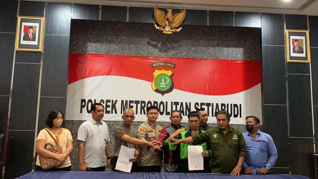 Kasus puluhan massa ojol menggeruduk kantor di kawasan Setiabudi, Jakarta Selatan (Jaksel), gegara salah satu rekannya diduga dipukul dengan stik golf sekuriti di lokasi berakhir damai. Perselisihan itu diselesaikan dengan cara kekeluargaan.