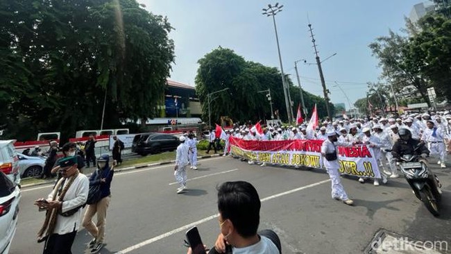 Pantauan detikcom, Jumat (4/11/2022), sejak pukul 12.50 WIB, massa mulai berkumpul di Pintu 6 Istiqlal. Mereka memutar arah berjalan kaki melawan arus Jl Katedral.