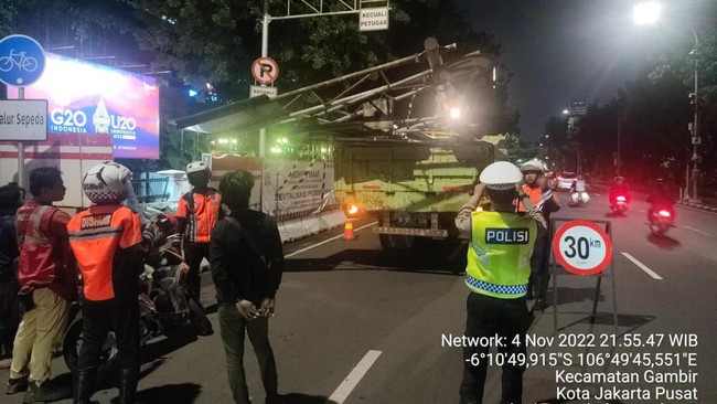 "Saat ini jajaran Dishub sedang melakukan evakuasi terhadap rambu tersebut dan melakukan pengaturan lalu lintas," ucap Syafrin pukul 21.48 WIB.