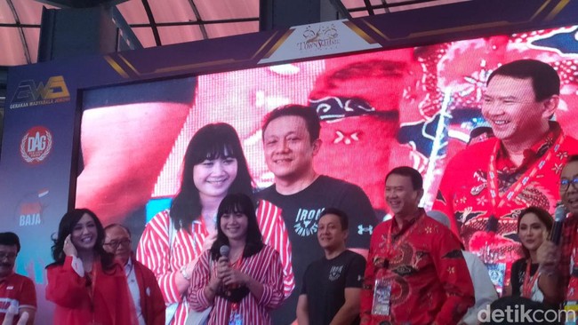 Mantan Gubernur DKI Jakarta Basuki Tjahaja Purnama alias Ahok menghadiri acara reuni relawan dan kawan flashmob hip-hip hura di Cilandak Town Square, Jakarta Selatan. Ahok tampak mengajak istrinya, Puput Nastiti Devi, menghadiri acara reuni relawan pada Pilgub 2017 itu.
