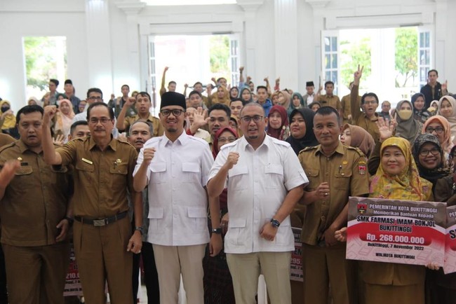 Anggota DPR RI asal Sumatra Barat (Sumbar) Andre Rosiade bersama Wali Kota Bukittinggi Erman Safar bersilaturahmi dengan guru honorer SMK, SMA dan SLB swasta di Bukittinggi, Senin (7/11) kemarin. Pertemuan tersebut dilakukan di rumah dinas Wali Kota sekaligus menyerahkan bantuan dana hibah Pemko Bukittinggi senilai total Rp 3,6 miliar.