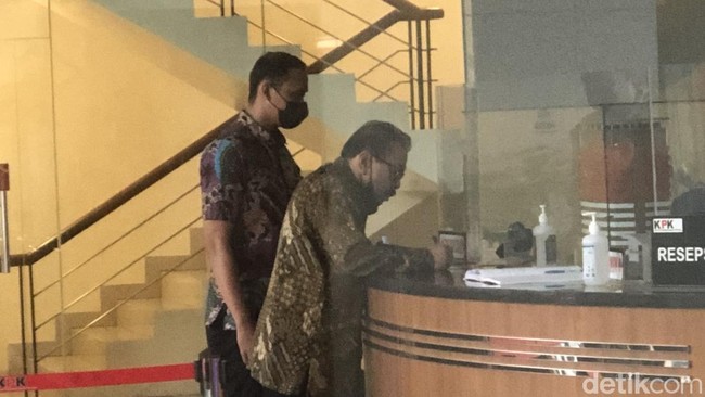 Tak lama kemudian, pegawai resepsionis KPK memberikan kalung tamu dengan tali berwarna merah kepada Pakde Karwo. Untuk diketahui, kalung tamu berwarna merah itu merupakan identitas seorang tamu KPK yang berstatus saksi.