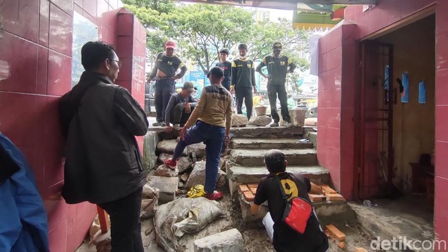 Pantauan detikcom di lokasi, Rabu (9/11/2022), petugas Dinas Pekerjaan Umum dan Penataan Ruang (DPUPR) Kota Depok memantau pembuatan anak tangga yang menghubungkan pintu gebang SD dengan trotoar Jalan Margonda. Seorang wali murid, Nia, mengaku kaget lantaran akses masuk gerbang tertutup trotoar Jalan Margonda.