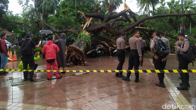 Pohon besar di Balai Kota DKI Jakarta tumbang menimpa polisi yang sedang bertugas mengamankan demo serta sejumlah sepeda motor. Kepala Dinas Pertamanan dan Hutan Kota Provinsi DKI Jakarta, Suzi Marsitawati menyebut pohon itu tumbang karena angin puting beliung.