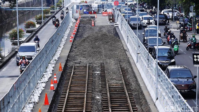 Pantauan detikcom di lokasi, Sabtu (12/11/2022) pukul 10.00 WIB, terlihat beberapa pekerja proyek MRT. Di sana terlihat mereka sedang memindahkan bongkahan tanah untuk menutup rel trem tersebut.