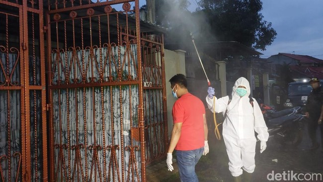 Selain polisi, turut hadir lurah dan ketua RT. Mereka juga disemprot disinfektan sebelum masuk ke rumah.