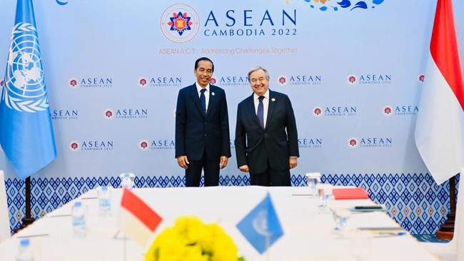 Presiden Joko Widodo (Jokowi) melakukan pertemuan bilateral dengan Sekjen Perserikatan Bangsa-Bangsa (PBB) Antonio Guterres di Hotel Sokkha, Phnom Penh, Kamboja. Jokowi menyampaikan terima kasih atas konfirmasi kehadiran Sekjen PBB di KTT G20 Indonesia.