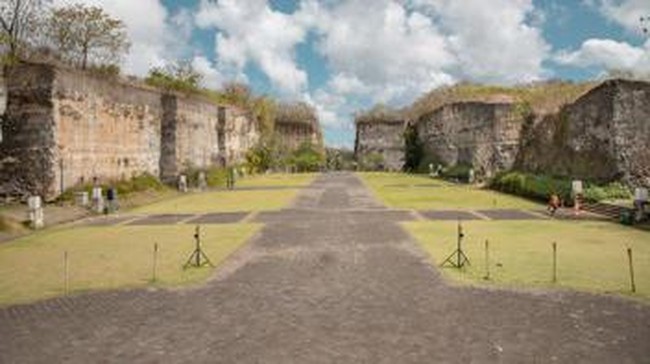 Pelataran yang luas membentang itu terlihat sangat megah dengan tebing kapur yang berjejer di kanan kirinya. Pemandangan di titik itu makin menawan dengan kehadiran patung Garuda di salah satu ujung deret tebing kapur.