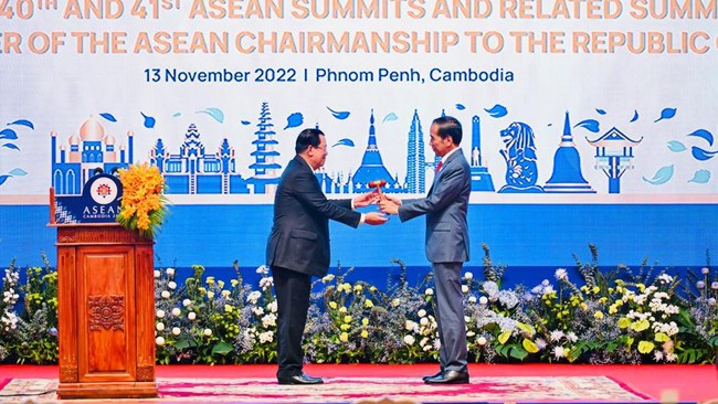 Indonesia resmi menerima estafet keketuaan ASEAN dari Kamboja dan menjadi Ketua ASEAN pada 2023. Penyerahan keketuaan itu dilakukan secara simbolis saat Presiden Joko Widodo (Jokowi) menerima palu dari Perdana Menteri Kamboja Hun Sen.