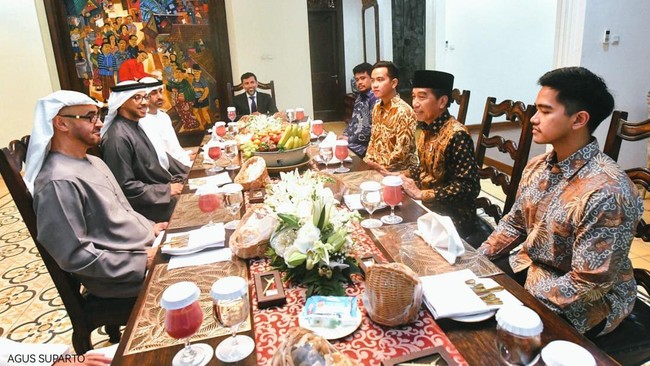 Presiden Joko Widodo (Jokowi) makan pagi bareng Presiden Uni Emirat Arab (UEA) Mohammed bin Zayed (MBZ) usai peresmian Masjid Raya Sheikh Zayed di Solo. Jokowi ditemani kedua putra dan menantunya.