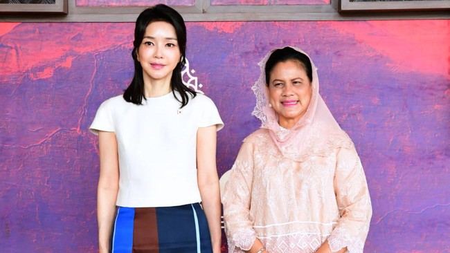 Ibu Negara Iriana Joko Widodo (Jokowi) menerima kedatangan Ibu Negara Republik Korea, Madam Kim Keon Hee, di Hotel The Apurva Kempinski, Bali. Iriana mengajak Madam Kim Keon Hee untuk minum teh bersama.