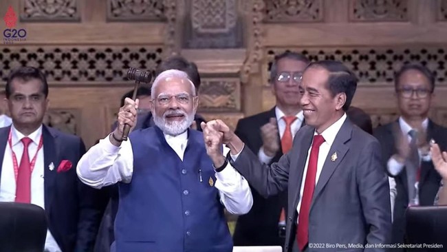 Presiden Joko Widodo (Jokowi) resmi menyerahkan mandat presidensi G20 kepada India. Jokowi secara simbolis memberikan palu kepada PM India Narendra Modi setelah KTT G20 Bali ditutup.