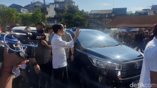 Jokowi tiba di Pasar Badung sekitar pukul 08.45 Wita, Kamis (17/11/2022). Warga langsung menyambut Jokowi begitu mobil kepresidenan tiba.