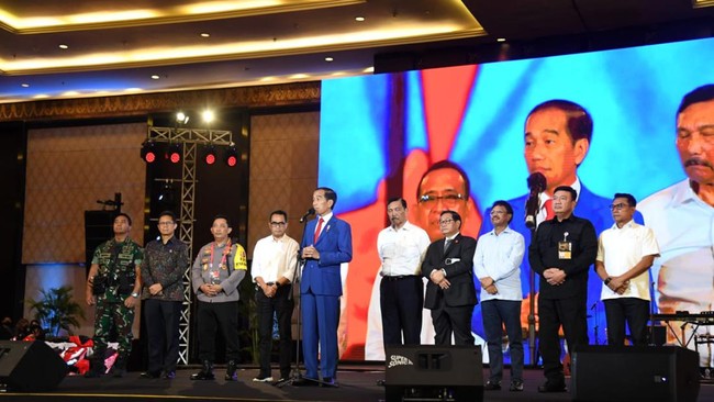 "Pertama-tama saya ingin menyampaikan penghargaan apresiasi yang luar biasa atas kerja keras Bapak-Ibu semuanya. TNI, Polri, BIN, pemerintah daerah, semua kementerian, semua lembaga, pendukung acara, semua kru hotel yang saya melihat manajemen integrasinya, organisasinya di lapangan sangat rapi," ujar Jokowi.
