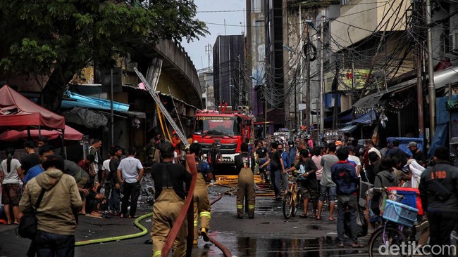 Petugas kebakaran juga masih berusaha memadamkan api. Para pedagang panik menyelamatkan barang dagangannya dari kobaran api.