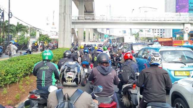 Sejumlah pemotor juga terlihat melintas di atas trotoar. Pemotor terlihat naik ke atas trotoar mulai dari depan Gedung Smesco.