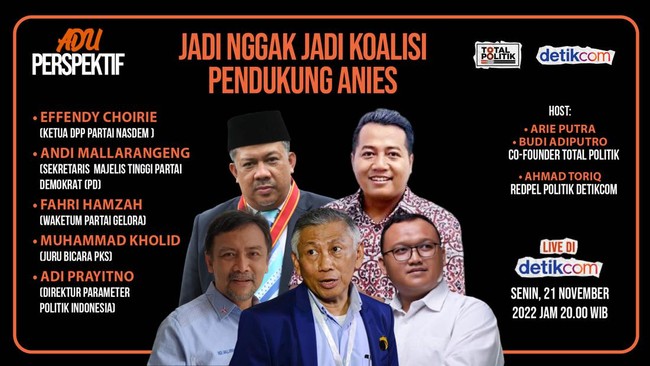 Adu Perspektif kali ini membahas topik Jadi Enggak Jadi Koalisi Pendukung Anies bersama politikus dan pengamat partai politik, yakni Effendy Choirie (Ketua DPP Partai NasDem), Kamhar Lakumani (politikus Demokrat) atau Andi Mallarangeng (Sekretaris Majelis Tinggi Partai Demokrat (PD), Fahri Hamzah (Wakil Ketum Gelora), Muhammad Kholid (juru bicara PKS), dan Adi Prayitno (Direktur Parameter Politik Indonesia). Acara disiarkan secara langsung dari detikcom, Senin (21/11/2022) pukul 20.00 WIB sampai selesai.